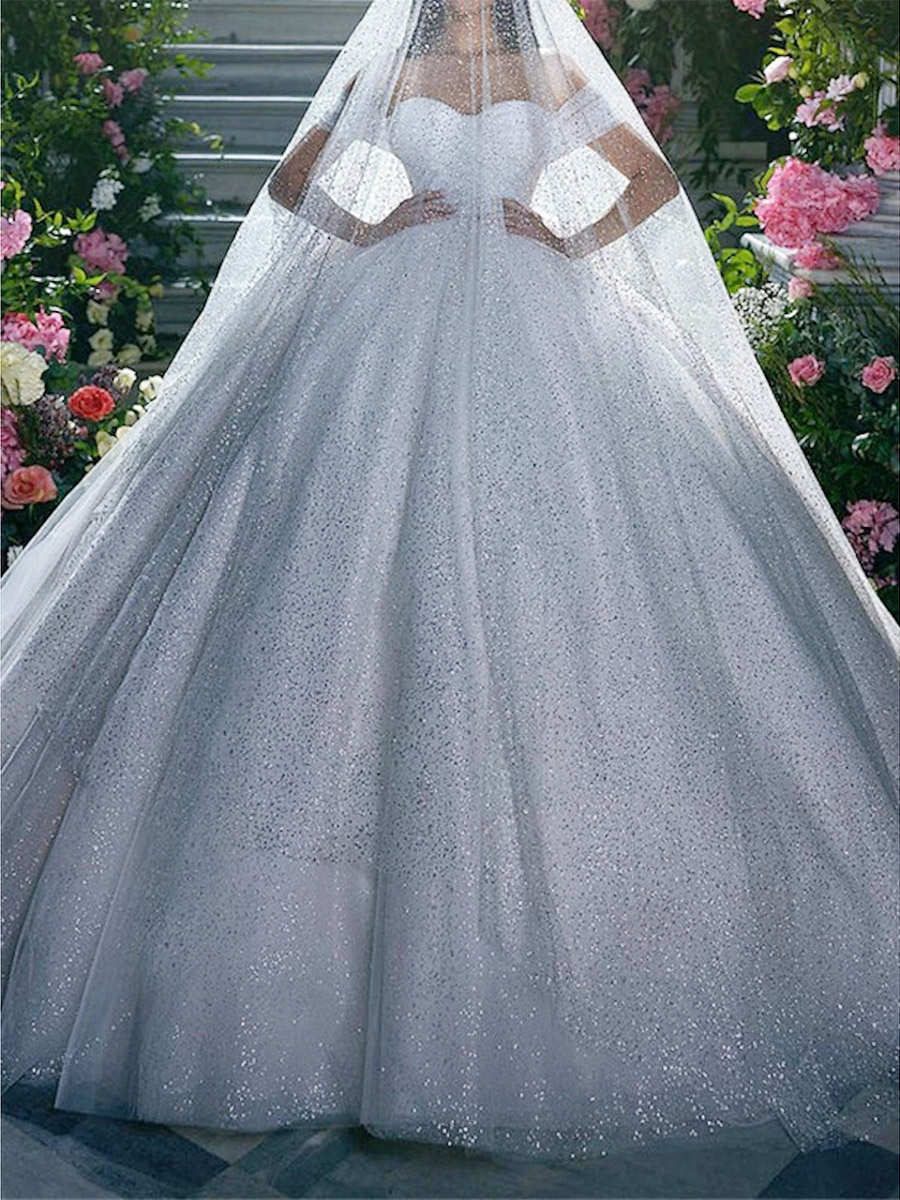 Lace Wedding Dress With Train Princess Silhouette Short Sleeves Tulle Strapless Bridal Dresses